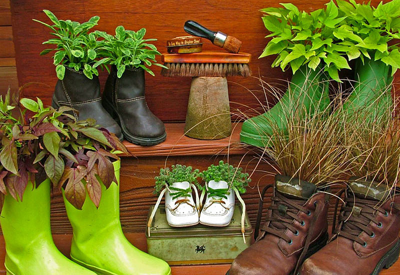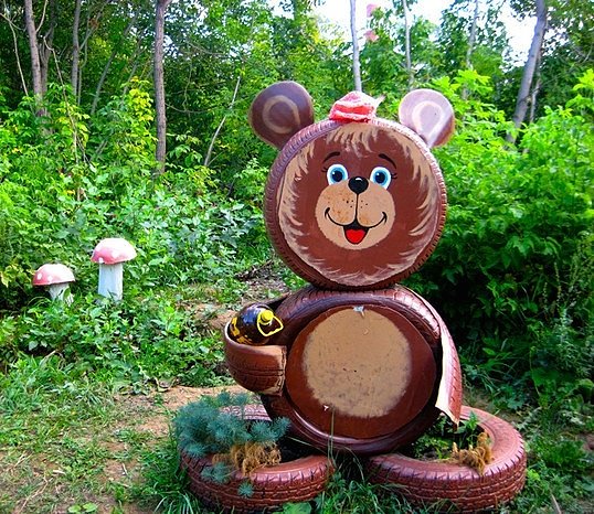 Старые шины могут стать вазонами, кашпо для цветов, превратиться в прекрасных лебедей, медведя и даже в пальму. Из бочек тоже можно сделать клумбы для цветов, или просто их оригинально раскрасить. Старые чашки и пни превратятся в оригинальные грибы. Коробки, ящики, старая посуда, обувь и даже сантехника все можно использовать для создания вазонов и клумб. Главное Ваша фантазия и желание преобразить этот мир!