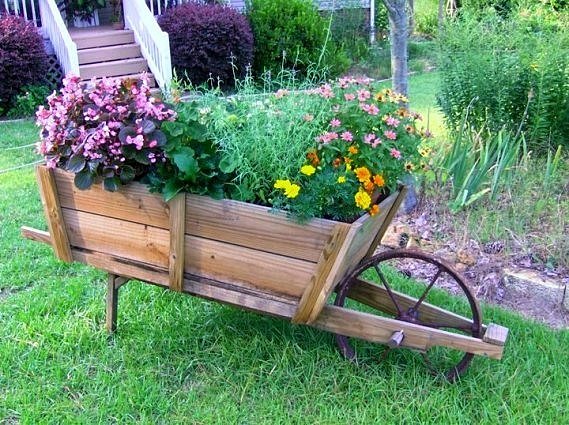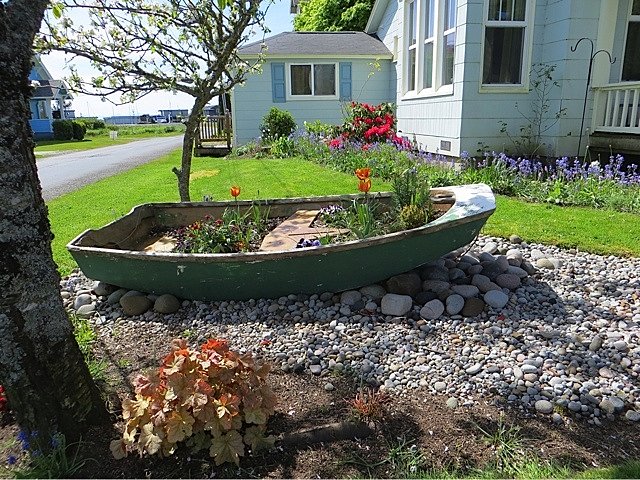Старая лодка может превратиться в оригинальный цветник. Просто вырежьте днище, заполните его торфом и высадите в нее растения. Наилучшим образом обновленное «плавсредство» будет выглядеть у водоема. Причем один из ее концов можно опустить в воду, создав иллюзию забытой на берегу лодки. Выбирайте растения, пригодные для выращивания в водоемах и переувлажненных почвах. Так вам удастся добиться максимальной стилизации.