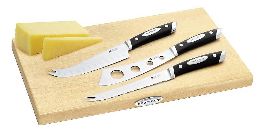 Ещё один нож – для нарезки сыра и колбасы. Этот нож с отверстиями, круглыми или овальными отверстиями на клинке, изогнутым раздвоенным концом, для переноски нарезанного продукта с разделочной доски на тарелку. Отверстия на клинке не дают прилипнуть продукту к лезвию, что очень удобно при нарезании большого количества продукта при сервировке стола.