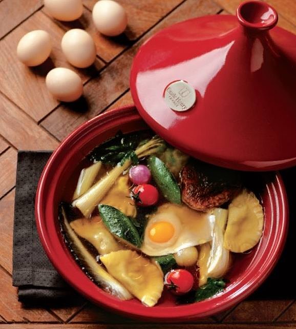Порубите лук-шалот и ветчину. Разогрейте каплю оливкового масла в тажине и обжарьте в нем ветчину с луком-шалотом. Добавьте 400 г гороха, бульон, соль и перец по вкусу, накройте крышкой и варите на медленном огне 15 мин.