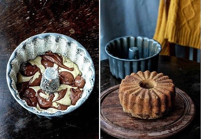 В форму поочередно выкладывайте зеленое и коричневое тесто. Разровняйте верх и выпекайте около 35-40 минут. Проверяйте при помощи деревянной палочки.