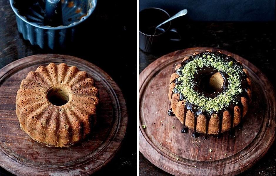 Испеченный кекс охладите. Шоколад разломите на части, залейте сливками и растворите на водяной бани. Слегка охладите и полейте глазурью кекс, а потом посыпьте все измельченными фисташками.
