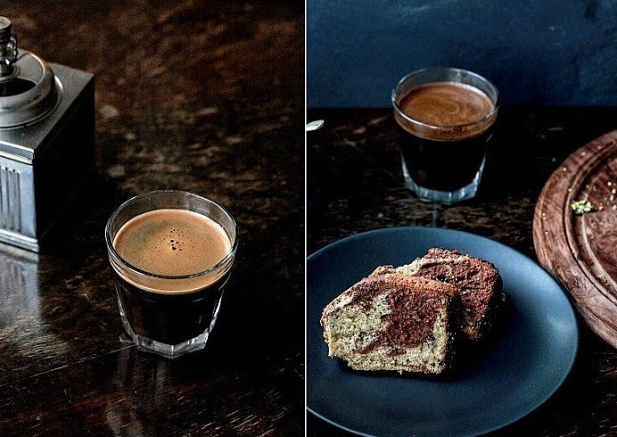 В одну часть всыпьте какао, 2 ложки охлажденного кофе. Слегка перемешайте, только до объединения ингредиентов.
