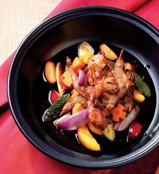 Очистите перепелов и разделите их на две части. Удалите излишки жира, особенное внимание уделите области вокруг шеи. На оливковом масле с добавлением розмарина и шалфея поджарьте перепелов на сильном огне в тажине до образования золотистой корочки. Посолив и поперчив, накройте тажин крышкой и оставьте дичь готовиться еще на 15 минут. Когда перепела будут готовы, выложите их на блюдо и накройте, чтобы не дать им остыть. Все овощи порежьте крупными кусочками и пожарьте их на сковороде в оливковом масле на сильном огне. Удалите косточки из фруктов, порежьте абрикосы и сливы на половинки, а персики и нектарины - на 4 части. Поместите фрукты в тажин, где готовились перепелки, и пару минут обжаривайте их на оливковом масле при высокой температуре. Затем добавьте к фруктам уже приготовленные овощи, поместите перепелок сверху, накройте тажин крышкой и выключите огонь. Оставьте блюдо на 5-6 минут, чтобы оно насытилось ароматом. Подавайте перепелов на отдельных тарелках, выложив их на горку из овощей и фруктов. Блюдо хорошо дополнит темное пиво, при этом в каждый бокал нужно выдавить несколько капель лайма.