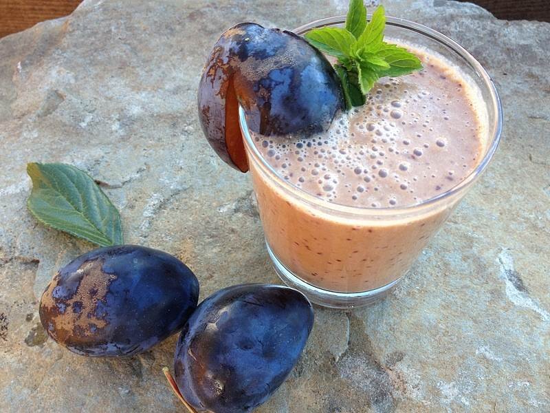 Сливы помыть, удалить косточки, дважды пропустить через мясорубку, отжать сок. Сок слив добавить к молоку. Взбить венчиков.