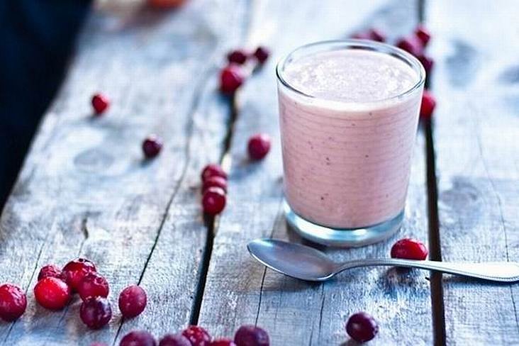 Клюкву смешать с пюре яблок. Быстро мешая тонкой струйкой, влить молоко. Делается это для того, чтобы молоко не успело свернуться.