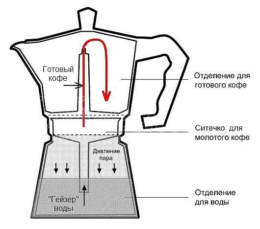 Кофеварка гейзерного типа состоит из емкости для воды (оснащена клапаном для стравливания излишнего пара), воронкообразной сеточки для молотых зерен, фильтра с резиновой прокладкой и верхнего бокса для сбора уже готового к употреблению напитка. В нижнюю часть заливается холодная вода, в сеточку помещается молотый кофе, верхняя емкость снабжается фильтром — после чего все элементы плотно соединяются в единую конструкцию.