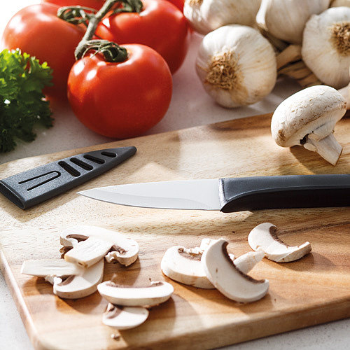 Не стоит забывать про подставку для ножа, которая защитит его от падения и про специальный инструмент для заточки, ведь форму керамического ножа, в отличие от стального, невозможно подкорректировать точильным камнем.