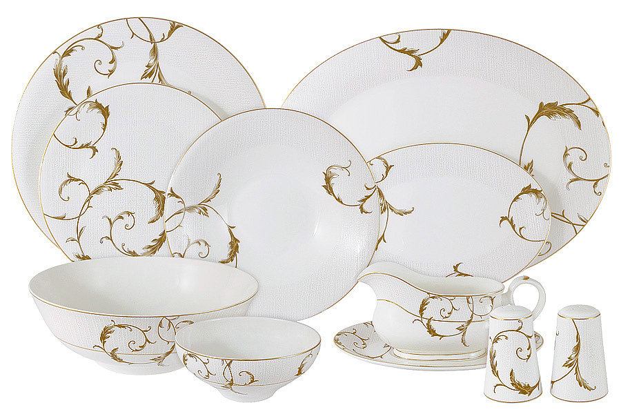 Пополнение любимых серий посуды чайными и обеденными сервизами «Элегия Голд» в золотом цвете и набором из двух чайных пар «Инфанта» оригинальной формы.
