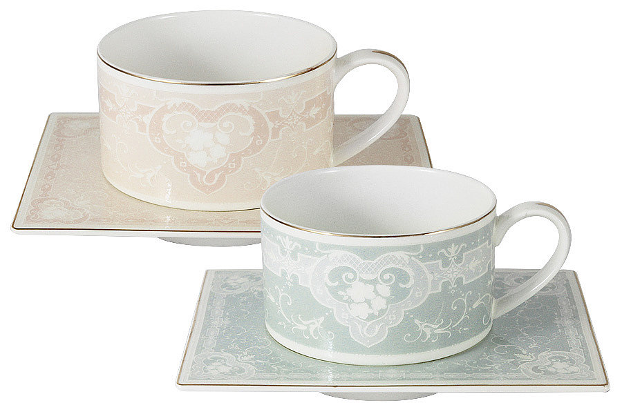 Новый набор из двух чайных пар в подарочной упаковке, с блюдцами необычной прямоугольной формы в коллекции «Инфанта». Переплетение изящных вензелей и растительного орнамента переносит нас во времена королей, принцев и принцесс. Серия представлена в двух цветовых вариациях: бледно-васильковой и королевско-розовой палитре.