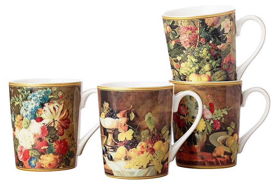 Новый набор из 4х фарфоровых кружек в подарочной упаковке, с декором по мотивам работ мастера фруктовых и цветочных натюрмортов - голландского художника Paulus Theodorus van Brussel.
