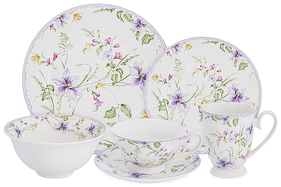 Современные формы качественного фарфора белого цвета из коллекции "Селена" подчеркнуты легкостью цветочного рисунка и нежностью красок. Все предметы украшают изображения нежных цветов и листьев. Коллекция «Селена» выполнена в сиреневых, розовых и зеленых тонах.