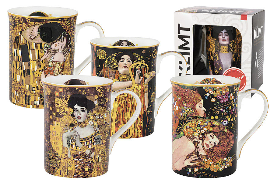 Кружки объемом 0.4 л из костяного фарфора с декором по сюжетам самых известных полотен мастера – "Поцелуй", "Юдифь", "Медицина" и "Семья".