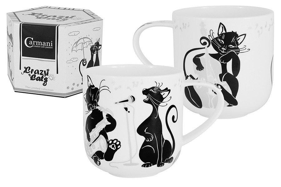 Любителям этих грациозных животных определенно понравятся новые кружки серии «Crazy Cats»: "Музыканты" и "Кошка в ванне" ТМ Carmani. Изображения кошек, когда они умилительно занимаются "человеческими" делами – принимают ванну, играют на музыкальных инструментах и поют – выполнены в графической манере, в черно-белой гамме с добавлением серого цвета.