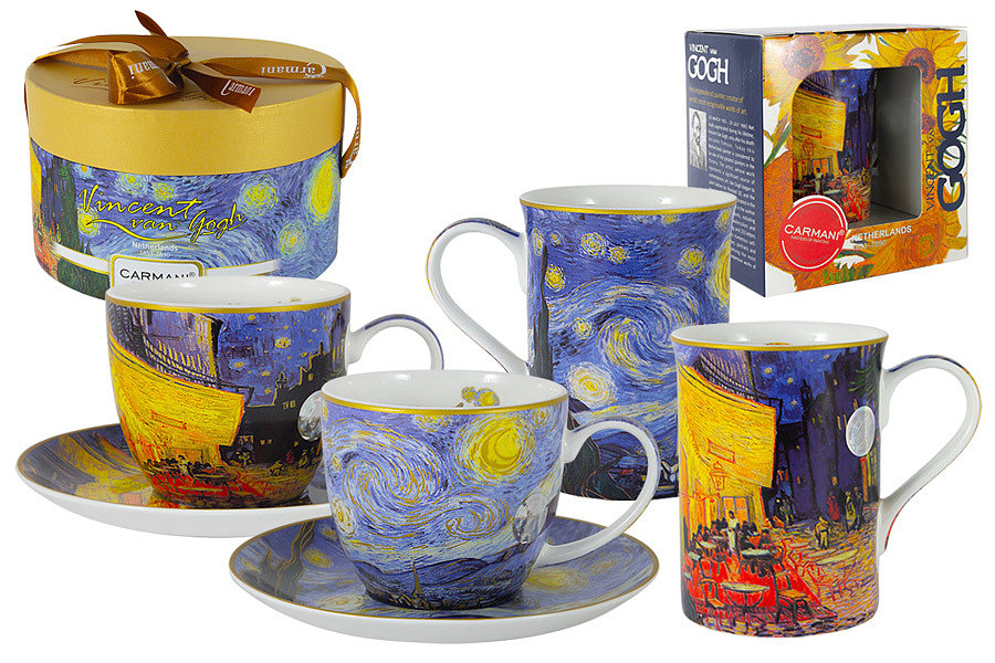 Интересные новинки для поклонников таланта Винсента Ван Гога - кружки и чайные пары с изображением сразу двух репродукций картин художника – "Ночная терраса кафе" и "Звездная ночь". Репродукции самых известных картин художника аккуратно нанесены на костяной фарфор с деликатным переходом от одного изображения к другому.