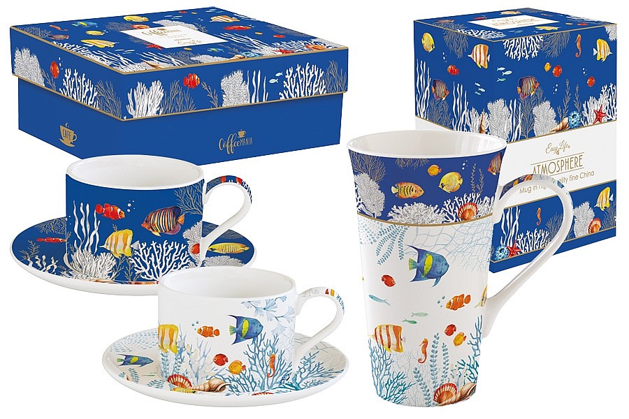 В наборе из двух чашек 240 мл с блюдцами красиво отработано цветовое решение - "негатив/позитив". Одна чашка с синим фоном с яркими рыбками и стилизованными