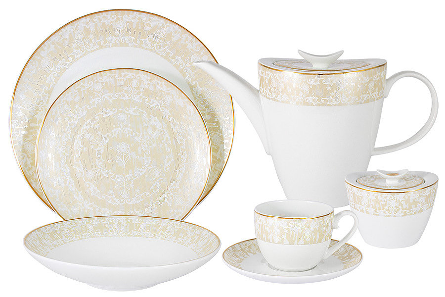 «Сияние» и «Перламутр» - две коллекции наборов посуды из костяного фарфора для сервировки стола на 6 персон.